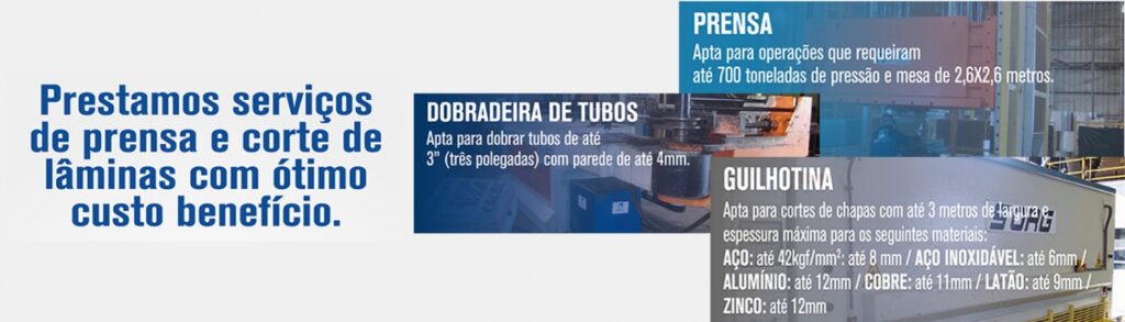 Guilhotina: apta para cortes de chapas com até 3 metros de largura com pressão de 42Kgf/mm² nas seguintes espessuras: