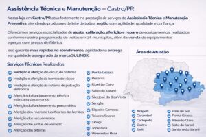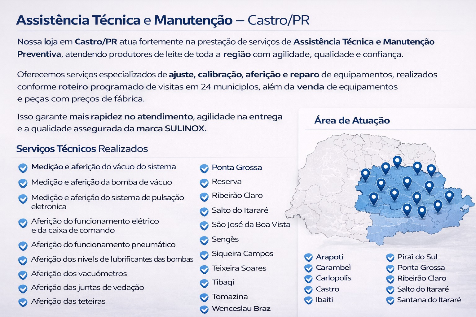 Nossa loja em Castro/PR atua fortemente na prestação de serviço de Assistência Técnica e Manutenção Preventiva aos produtores de leite da região.